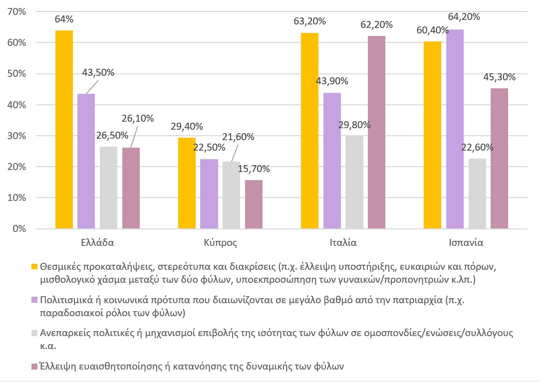 Γράφημα 1: Οι πιο δημοφιλείς απαντήσεις στην ερώτηση «Ποια πιστεύετε ότι είναι τα κυριότερα εμπόδια για την ισότητα των φύλων στο προπονητικό επάγγελμα στη χώρα σας;» (% ανά χώρα)